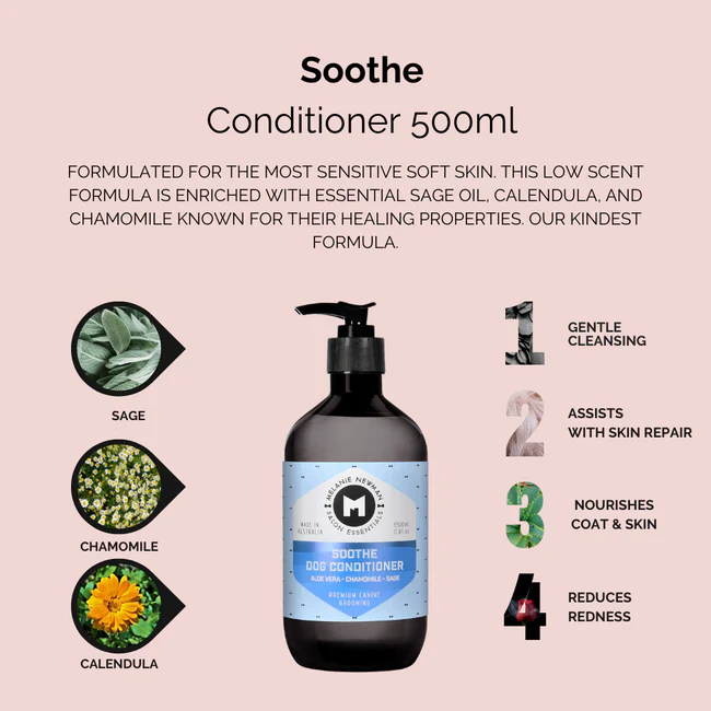 Oferă câinelui tău îngrijirea cea mai delicată cu Soothe Conditioner Melanie Newman, un balsam profesional creat pentru câinii care au nevoie de hidratare profundă și o experiență de grooming low-scent (cu parfum discret).