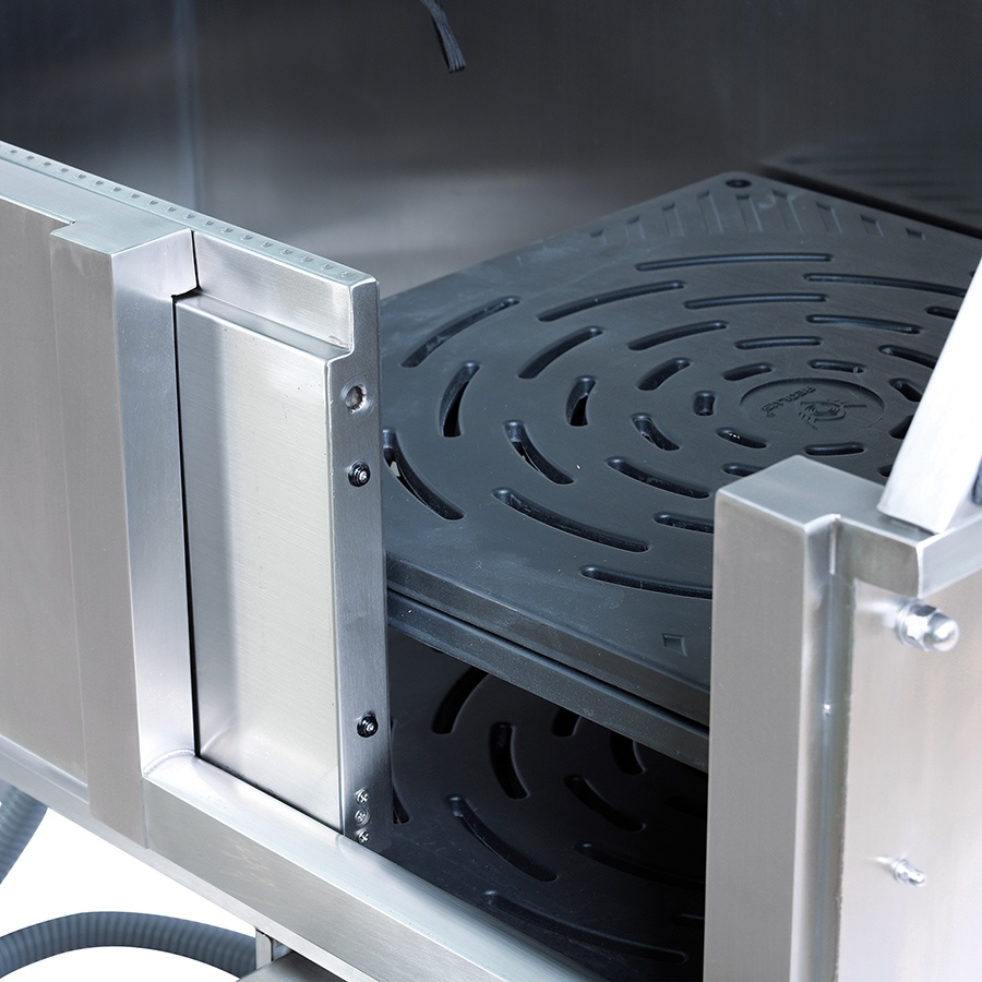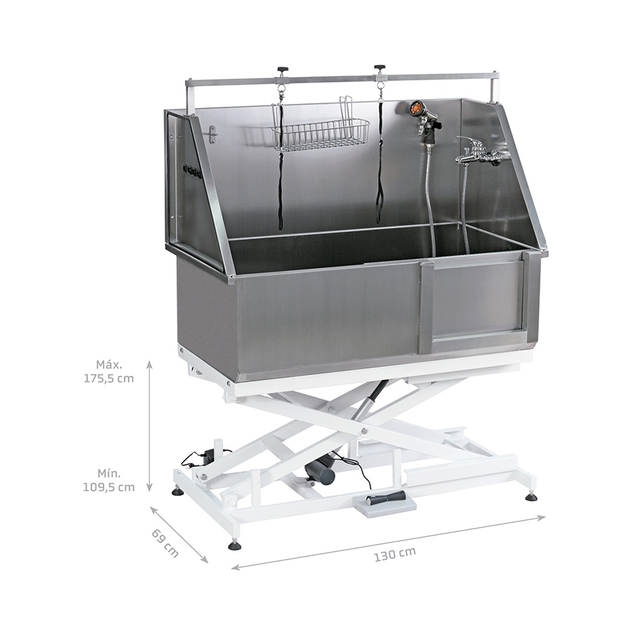 – panel perforat separat de pardoseala, pentru a facilita scurgera apei si care poate fi reglata pe 2 nivele in functie de inaltimea cainelui