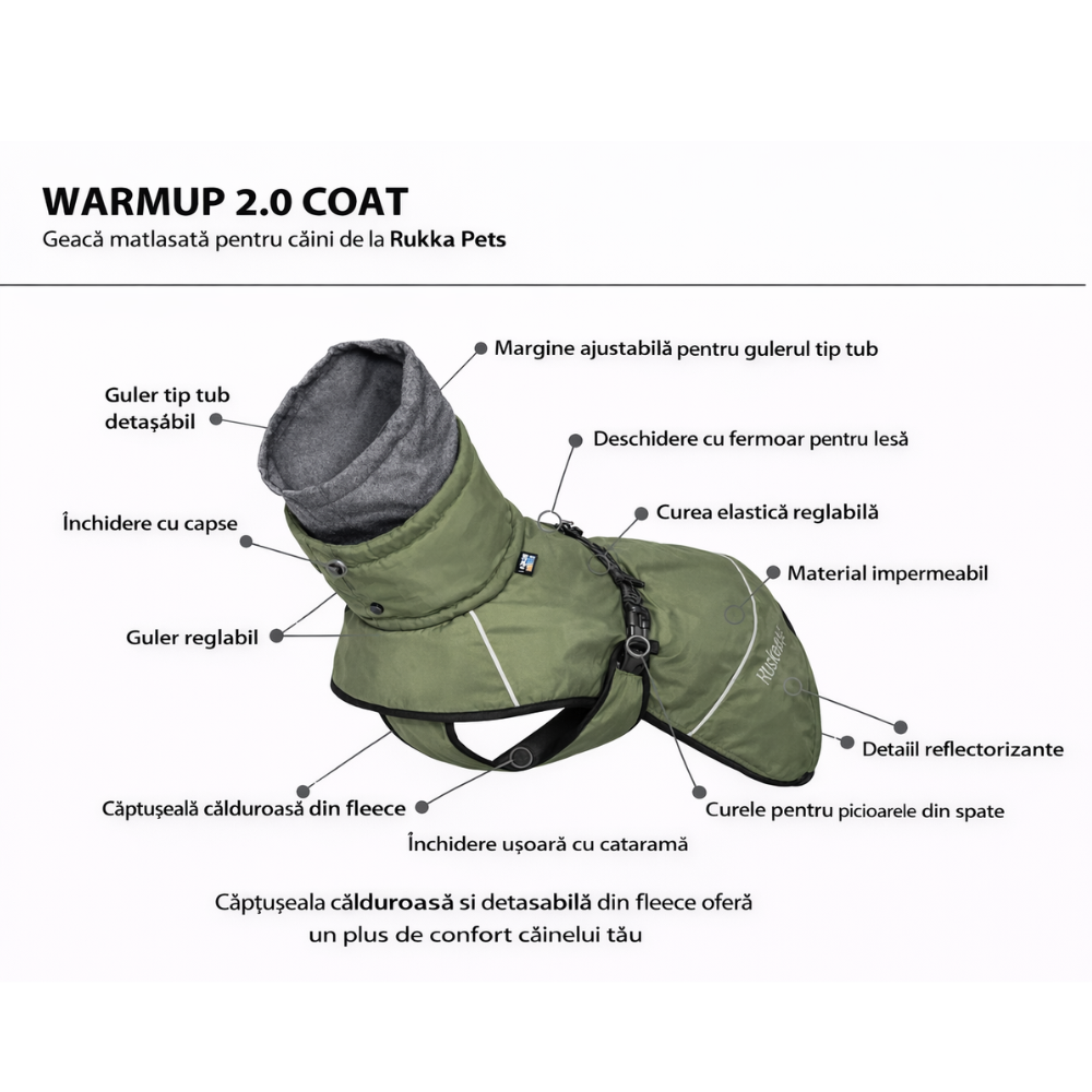 Rukka Pets Warmup 2.0 Coat Olive este o geacă călduroasă și rezistentă la apă pentru câini, cu guler înalt, material izolant și detalii reflectorizante, perfectă pentru plimbări confortabile în sezonul rece.