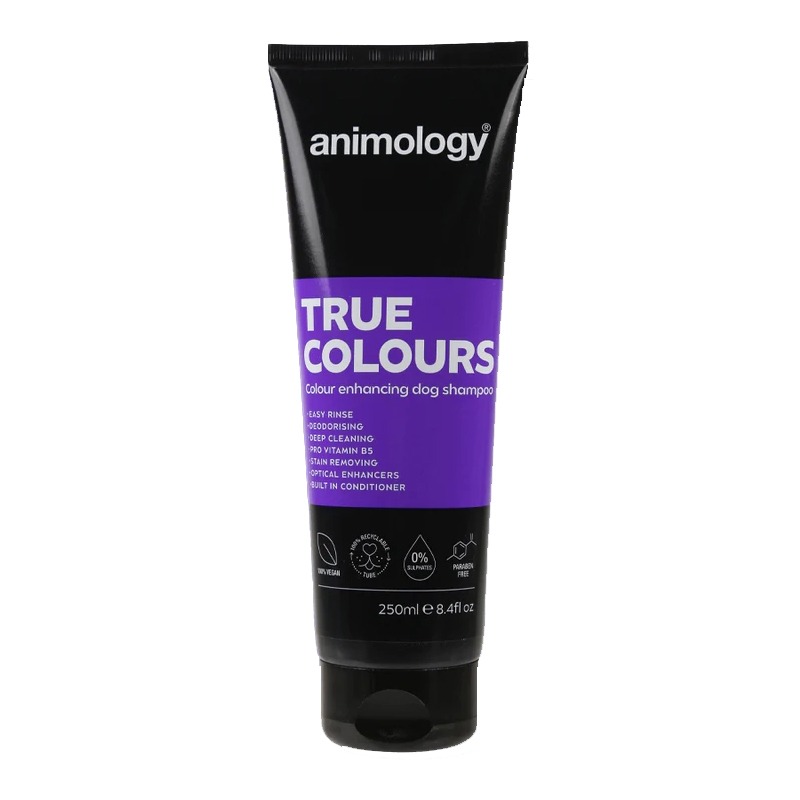 Contine balsam si provitamina B5, astfel ca ajuta la mentinerea blanii cainelui tau frumoase, curate si sanatoasa. True Colors are, de asemenea, o formula de curatare profunda si de indepartare a petelor pentru a ajuta la redarea culorii si a aspectului natural al blanii cainelui tău.