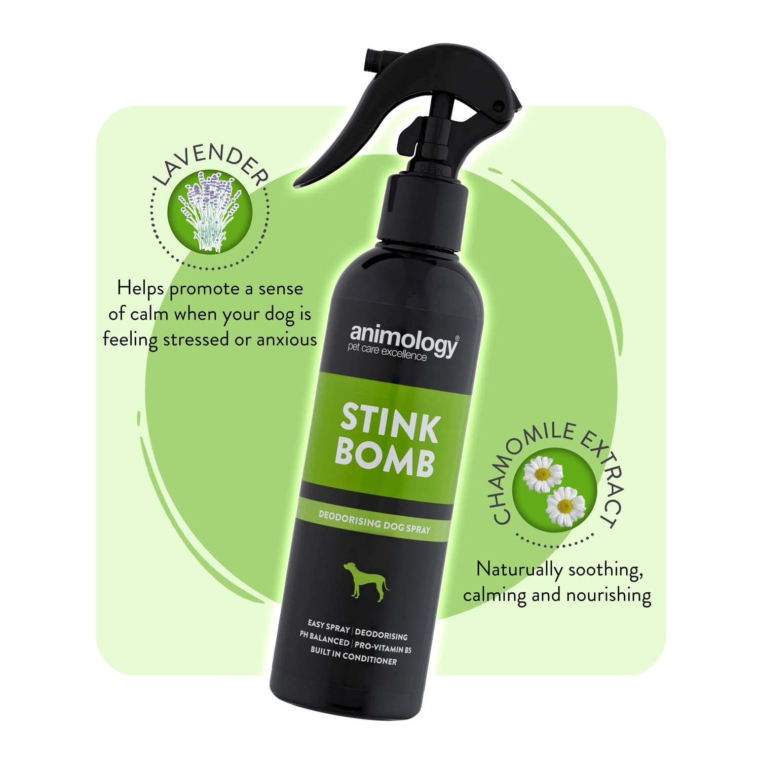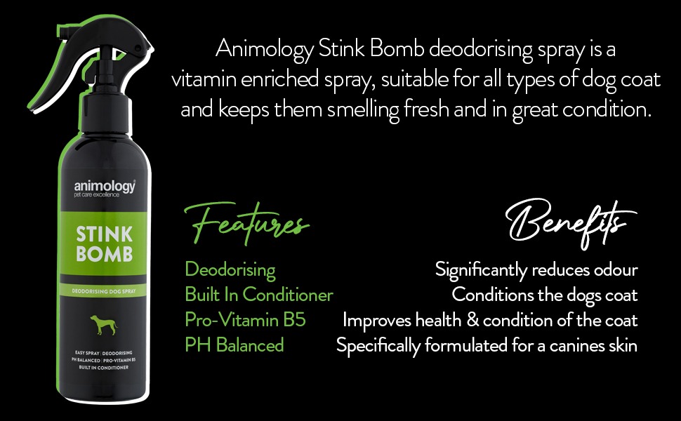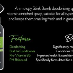 Stink Bomb este un spray deodorant pentru caini, imbogatit cu vitamine si balsam pentru a ajuta la mentinerea starii de bine a blanii cainelui tau.